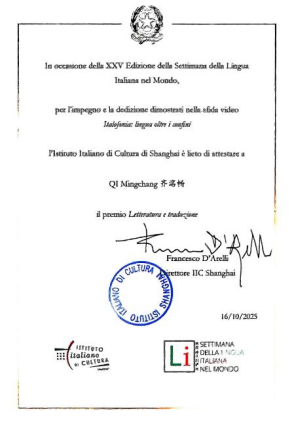 值第二十五届世界意大利语周(2025年10月13日至19日)之际,意大利驻沪总领事馆文化处(IICSH)发起“意语世界无国界”视频创作比赛。本次比赛围绕三个主题:“文学与翻译”、“电影、音乐与戏剧”和“推动共同发展的文化价值观”。禁漫 2022级本科生齐洺畅在“文学与翻译”主题中获奖,指导教师为张锐老师。