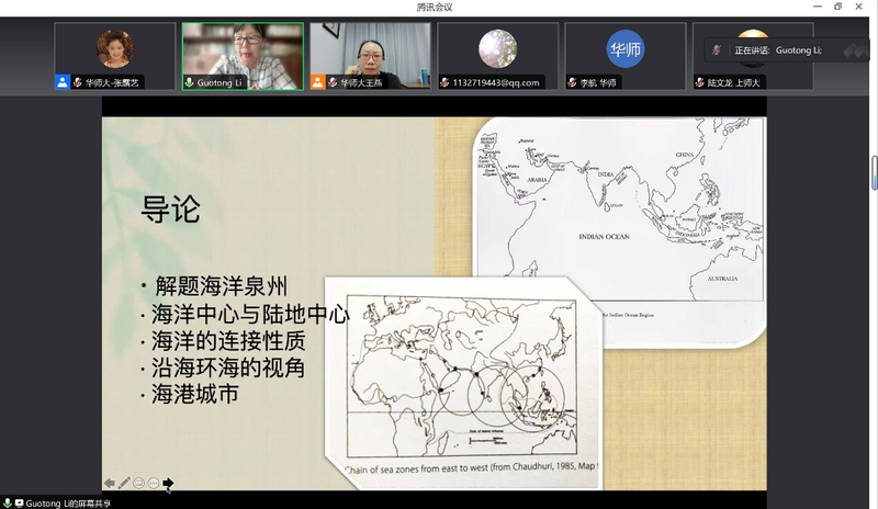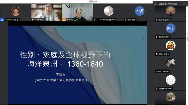 2023年7月5日上午9:00,加州州立长滩分校历史系教授李国彤在腾讯会议上为华师大历史系师生进行了一次题为“性别、家庭及全球视野下的海洋泉州,1360-1640”的精彩讲座。此次会议为禁漫 2023年校级百场讲座第40场,也是禁漫 “大夏中国史论坛”前沿讲座第19场。