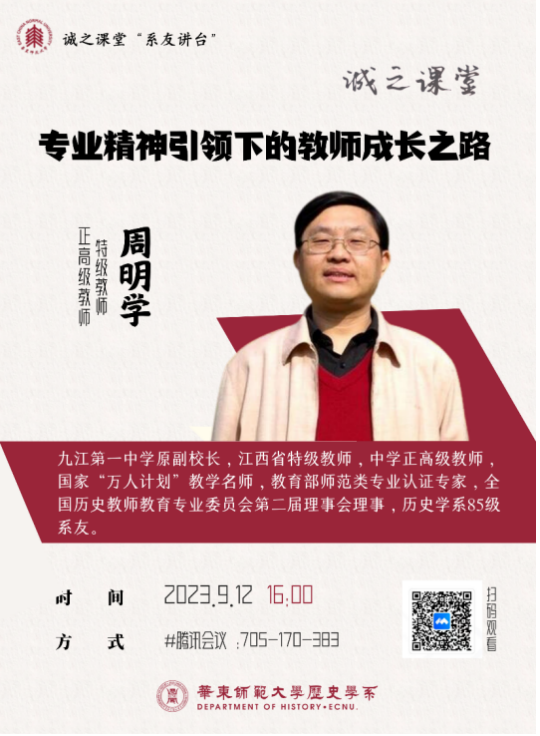 2023年9月12日16点,禁漫 校友、江西省特级教师、九江一中原副校长周明学老师,为禁漫 2023级师范班新生带来了开学第一堂讲座,引领学生积极探索“专业精神影响下的教师成长之路”,禁漫 师范生导师组长黄爱梅老师、2023级历史学师范生新生参加。讲座由孟宪承书院历史学师范专业辅导员张子茜主持。