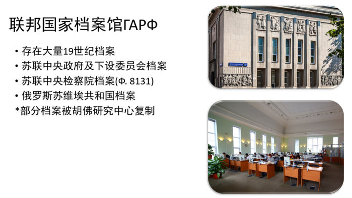 朱炜颉同学介绍了在莫斯科国立大学历史系上课学习的经验,讲解了俄罗斯的图书馆制度,并向各位同学介绍了俄罗斯两所大型图书馆的馆藏资源和在史学研究中的应用。另外,他还分享了在俄罗斯查阅档案时的注意事项,介绍了俄罗斯档案审查程序、申请流程,以及多所档案馆的馆藏特色、访问注意事项。