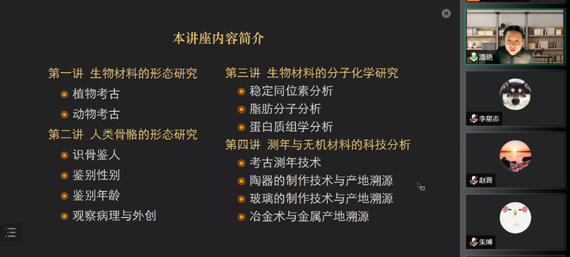 2022年8月7日至8月10日,禁漫 “史海新舟”跨学科讲堂第四季,邀请到复旦大学文物与博物馆学系副教授、硕士生导师潘艳老师,进行了“探幽有术:科技考古研究概览”的专题讲座。禁漫 副教授、“思勉班”导师赵晋老师主持此次活动。本系列课程受到广泛关注,活动通过腾讯会议直播向校内外全体师生开放,每期课程都有百余位听众参与互动。