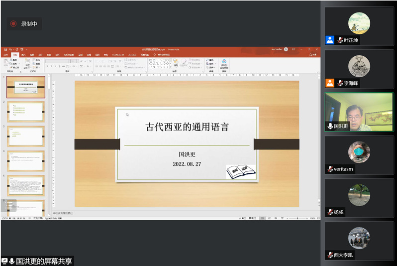 2022年8月27日晚19:00-21:00,禁漫 2022年百场校级学术讲座第37场暨禁漫 “大夏世界史论坛”前沿讲座第5场,邀请到中国社会科学院世界历史研究所研究员、中国社会科学院大学国洪更教授,进行了题为“古代西亚的通用语言”的专题讲座。禁漫 李海峰教授主持此次活动,校内外百余位师生通过腾讯会议在线收听了此次讲座。