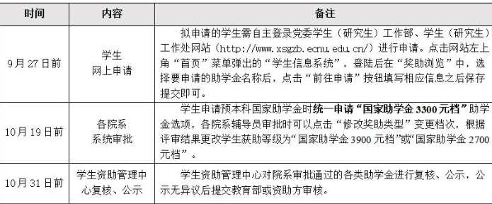 预本科生 国家助学金 | 平均3300 | 1、已通过我校家庭经济困难认定的预本科学生; 2、不含公费师范生; 3、原则上(1)通过认定的建档立卡等特殊困难学生应以第一档次全覆盖(2)特别困难、比较困难等级的新生应优先覆盖。 | 1、名额:14; 2、系统打印出来的《本专科生国家助学金申请表》纸质版一式一份于10月19日前提交到学生资助管理中心; 中北:大学生活动中心504 闵行:学生之家B304 3、电子版《国家助学金(预本科)获助学生名单汇总表》(详见附件2)请于10月19日前邮件发送到[email protected]。 |