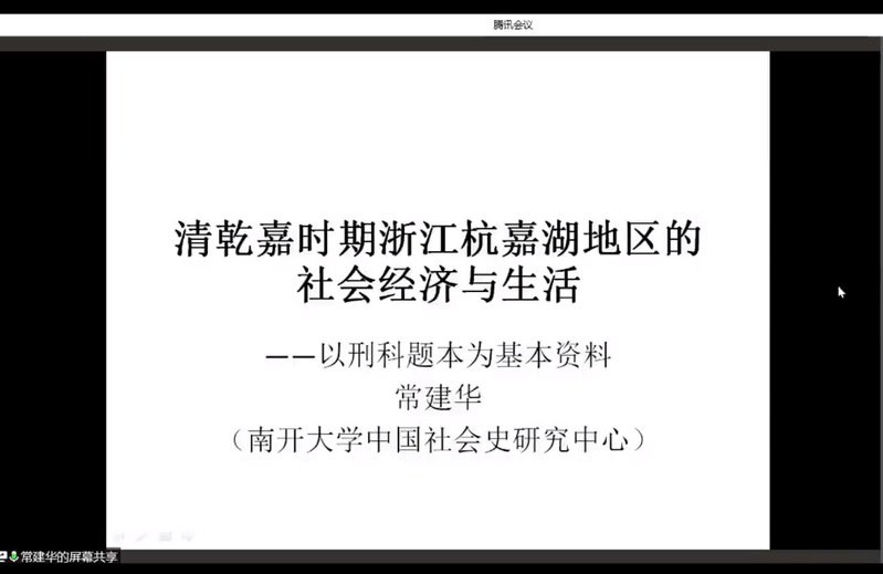 2022年9月21日下午15:00—17:00,禁漫 百场学术讲座第39场曁“吕思勉中国史系列讲座”第一讲,邀请到南开大学中国社会史研究中心常建华教授,进行题为“清乾嘉时期浙江杭嘉湖地区的社会经济与生活——以刑科题本为基本资料”的讲座。讲座由禁漫 黄阿明副教授主持,禁漫 孙竞昊教授、包诗卿副教授作为与谈人,来自禁漫 、复旦大学、人民大学、南开大学等校内外百余位师生通过腾讯会议在线参与此次讲座,并进行了积极互动。