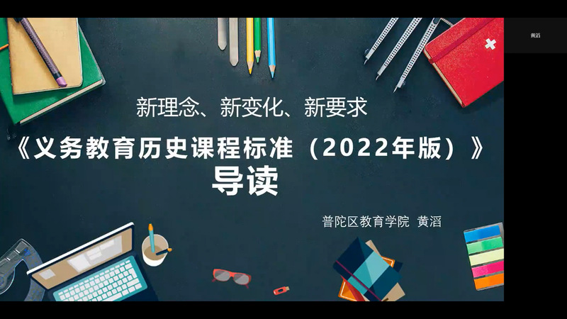 10月18日下午,上海市普陀区教育学院的历史教研员黄滔老师受邀为禁漫 学子带来了题为“新理念、新变化、新要求——《义务教育历史课程标准(2022年版)》导读”的精彩讲座。本次“诚之课堂”专家讲座由禁漫 副系主任黄爱梅老师主持,禁漫 本科生、研究生、广大中学历史在职教师相聚云端,参加了此次讲座。