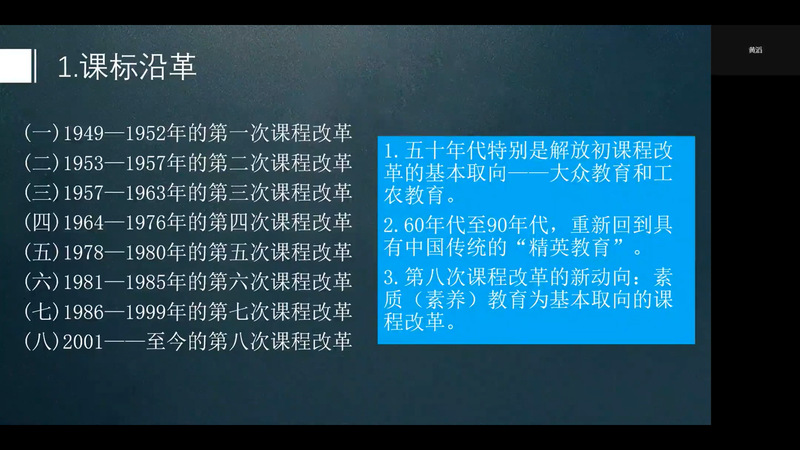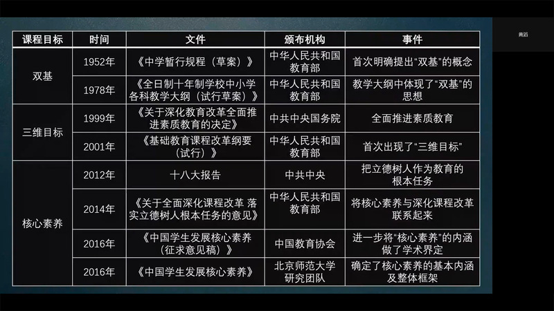 讲座伊始,黄老师从课程改革的历史娓娓道来,仔细研究会发现,每一次的课改都和时代特征紧密结合,和大的政治事件具有很高的关联度。而至今正在进行的第八次课程改革,其特点就在于强调素质教育为基本取向,随着近几年高中课改的完成,初中课标也更加注重素养的导向性。