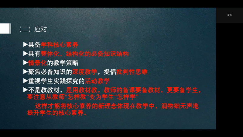 在最后一节,黄老师指出,新课标带来的挑战是要形成新的认知观(要发生学习迁移、真实解决问题)、新的教学观(注重以学生为中心的教学学习、重视在教学过程中培养思维)和新的评价观(多元评价学生、增量评价学生)。而对于挑战,黄老师也提出了有效的应对之措,即要采取各种方式,将核心素养的新理念体现在教学当中中。