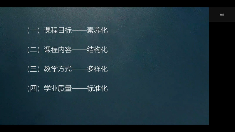 这一部分是黄老师讲座的重点。通过研读课标,黄老师梳理出四个变化,主要是课程标准的素养化、课程内容的结构化、教学方式的多样化和学业质量的标准化。接下来,黄老师就每一重变化都做了详细的解释。