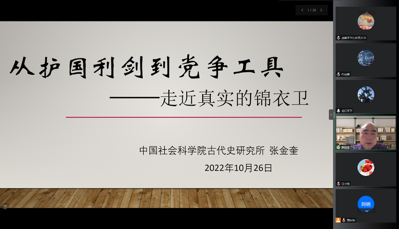 2022年10月26日下午15:00—17:30,禁漫 百场校级学术讲座第41场曁“大夏中国史论坛2022年前沿讲座”第2讲,邀请到中国社会科学院历史研究所明史研究室研究员、中国明史学会副会长张金奎老师,进行题为“从护国利剑到党争工具——走进真实的锦衣卫”讲座。禁漫 副教授黄阿明主持此次活动,禁漫 副教授包诗卿作为与谈人,来自禁漫 、复旦大学、中国社会科学院大学等校内外数百余位师生通过腾讯会议在线参加此次讲座。