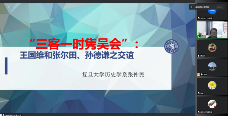 2022年11月9日,下午两点到四点,复旦大学历史系张仲民教授应邀做《“三客一时隽吴会”——王国维和张尔田、孙德谦之交谊》讲座,此为禁漫 2022年百场校级讲座之第66场和2022年禁漫 “大夏中国史论坛”前沿讲座之第五场。讲座由禁漫 阮清华教授主持,为了更多听众受益,讲座采用线上方式进行,来自全国各地众多高校和科研院所的100多名师生收看和参与了讲座。