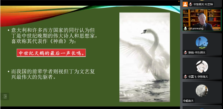 2022年11月26日,中国译协汉译意研究会会长、中国意大利文学研究会副会长、北京外国语大学意大利语言文学教授、“资深翻译家”王军老师应邀开展了一场主题为《但丁与<神曲>》的线上讲座。本次讲座系“百场校级学术讲座”暨“大夏世界史论坛高端讲座”,由禁漫 张锐老师主持,吸引了来自禁漫 、北京大学、中国社会科学院、南京大学、浙江大学、中山大学、天津大学、北京外国语大学等高校的近300名师生。