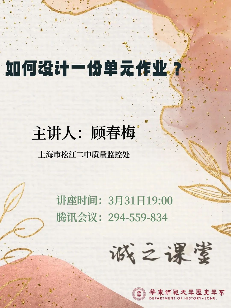 3月31日晚七时,禁漫 诚之课堂专家讲座于线上顺利开讲,本次活动邀请了上海市松江二中质量监控处顾春梅老师给我们传授“如何设计一份单元作业”。在本次讲座中,顾老师深入浅出地从作业的功能、单元选择、题型选择、情境设计、作业设计的学业水平考量、科学性等多个方面,详细讲解了单元作业设计的全过程,结合同学们此前“诚之杯”提交的作品点评,向我们提供了很多实用性的知识和技能。
