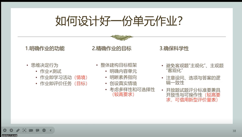 本次讲座全面介绍了单元作业设计的重要性和相关原则,详细且条分缕析的讲解使参会者深入了解到单元作业设计的方法与需要注意的问题,对于如何更好地为学生制定更好的作业起到了启发作用。
