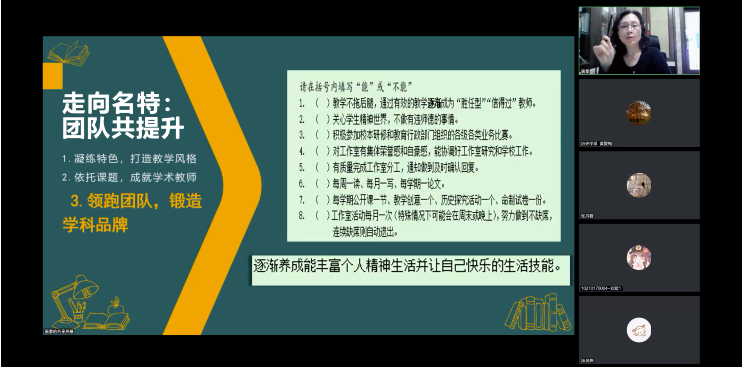 骨干教师要进一步走向“名特”,唐老师强调了团队的重要性,她指出靠个人力量无法成长,要与同伴协同研究,或者组建一个团队,或者加入一个团队。可惜因时间关系,这一部分未能充分展开。