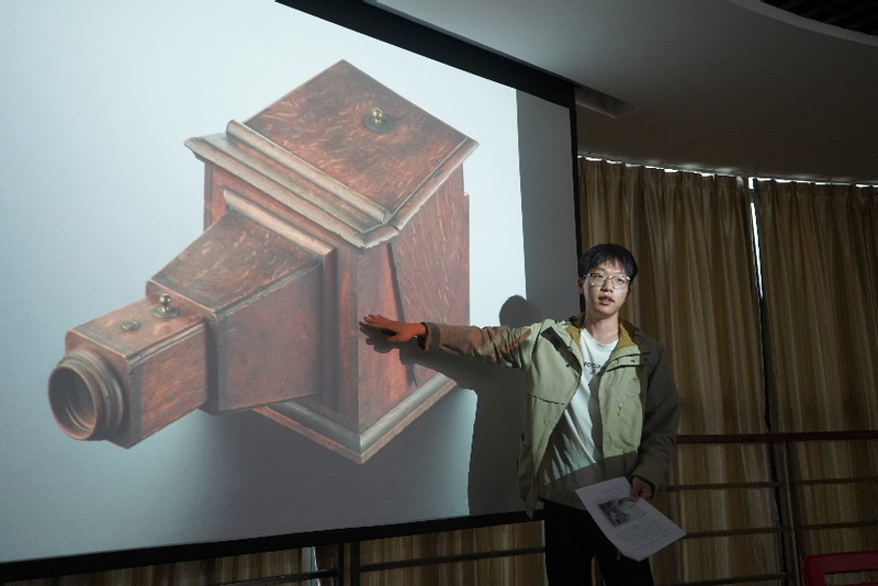 在师生交流互动环节,禁漫 2020级本科生梁浩同学为大家演示了暗箱(Camera obscura)操作技术在早期欧洲风景画发展史上作用。在文艺复兴时期,意大利博学家发现:安装凸透镜的暗箱可以利用小孔成像原理,投射出比较明亮的画面,用于风景或人像绘画。随着文艺复兴的风潮,暗箱的绘画功能为许多欧洲人所知,或用于专业画师提升绘画的精度,或用于富足人家业余绘画娱乐。暗箱也在传播过程中不断改进设计,为更多人接受使用。梁浩同学以清晰的语言和深入的分析得到老师、同学的一致好评。