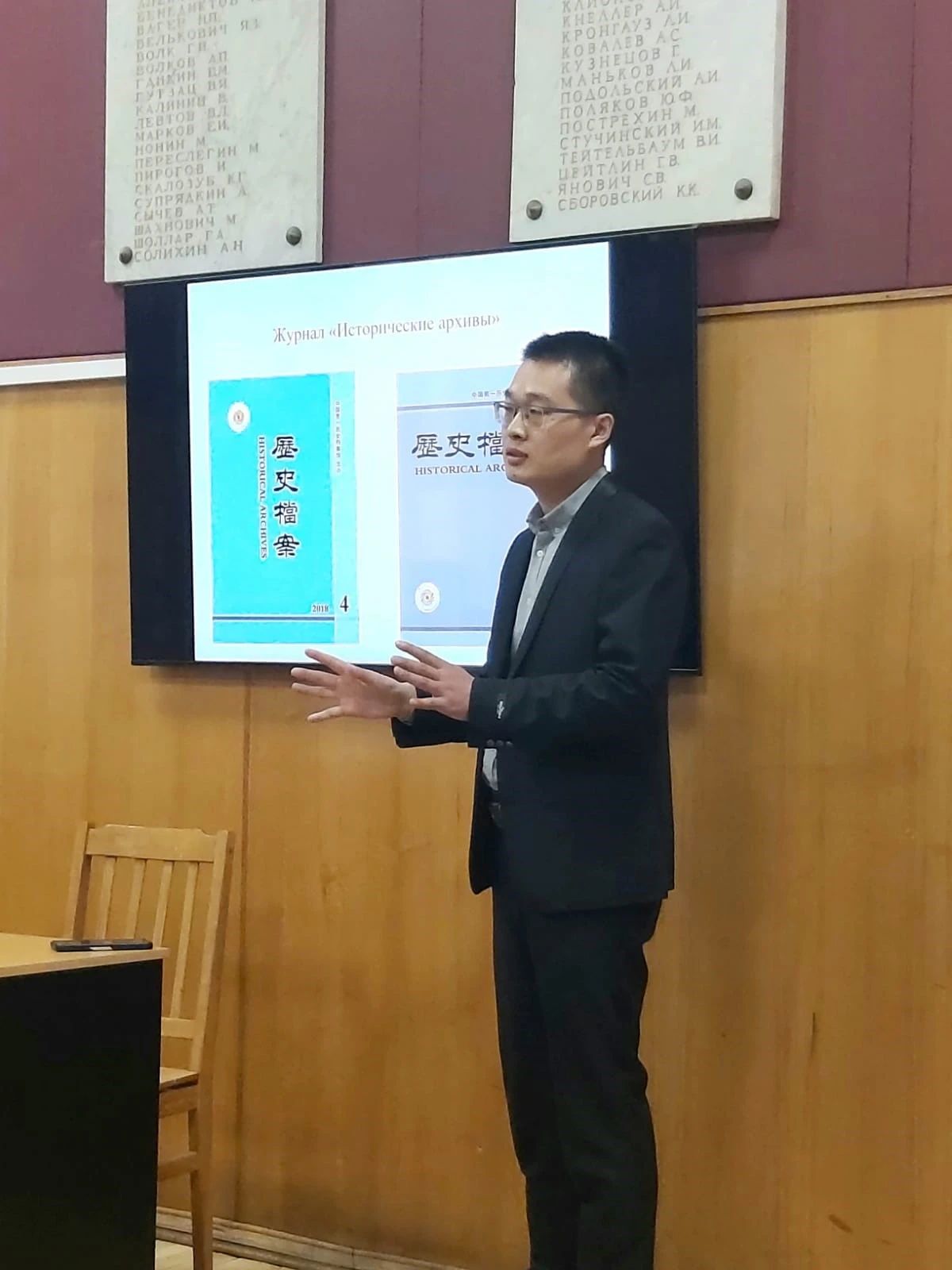 之后,霍佳科夫教授主持了讲座,圣彼得堡国立大学禁漫 主任达乌德夫(А.Х. Даудов)教授和档案中心主任施特科夫(Н.В. Штыков)副教授分别致辞。讲座过程中,谷继坤首先围绕中国第一历史档案馆、中国第二历史档案、中国外交部档案馆以及北京市档案馆等馆藏档案,相关档案杂志和中国领导人年谱文稿等档案文献资料,对中国档案的开放利用情况进行了介绍。接着,谷继坤就“中国工人在苏联(1955-1964)”这一主题介绍了相关档案资料和其本人的最新研究以及中俄学术界围绕该问题的学术观点分歧。最后,谷继坤回答了霍佳科夫教授和与会同学们的问题。