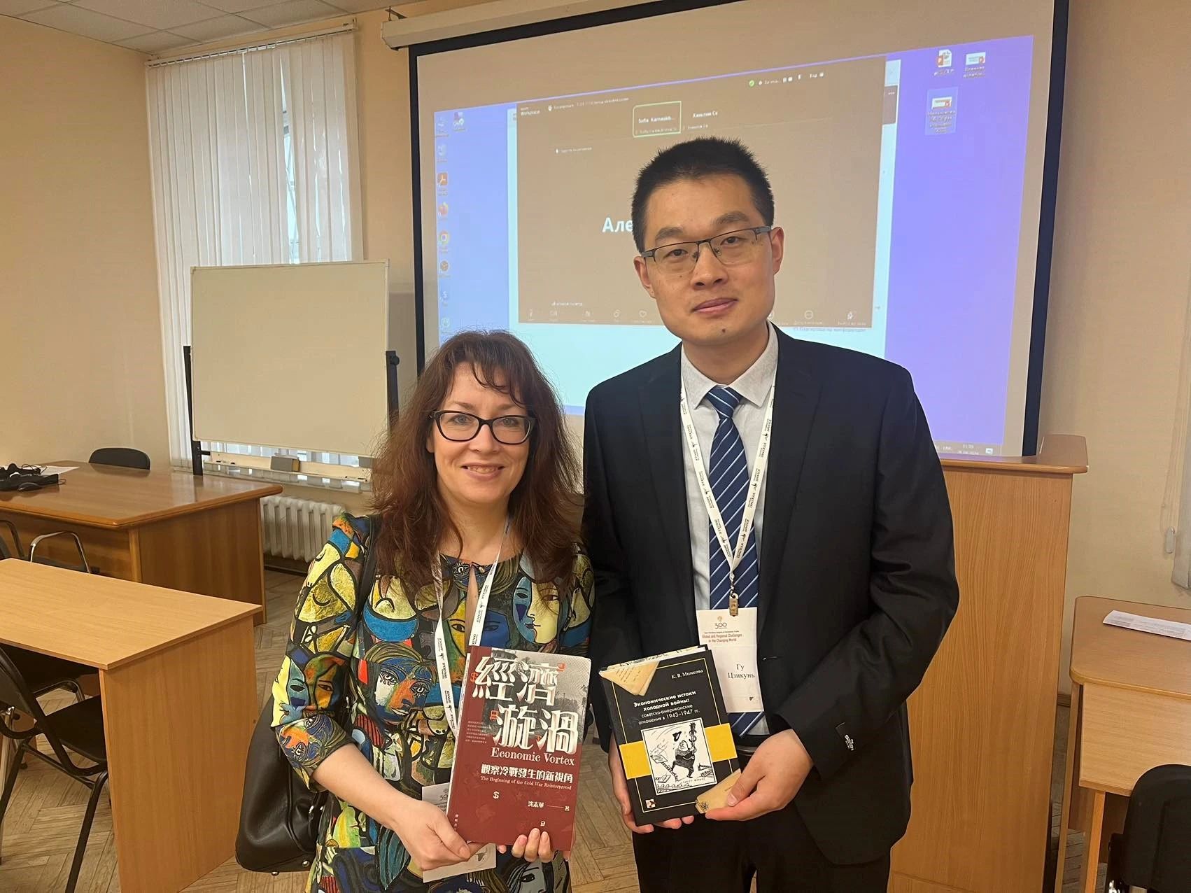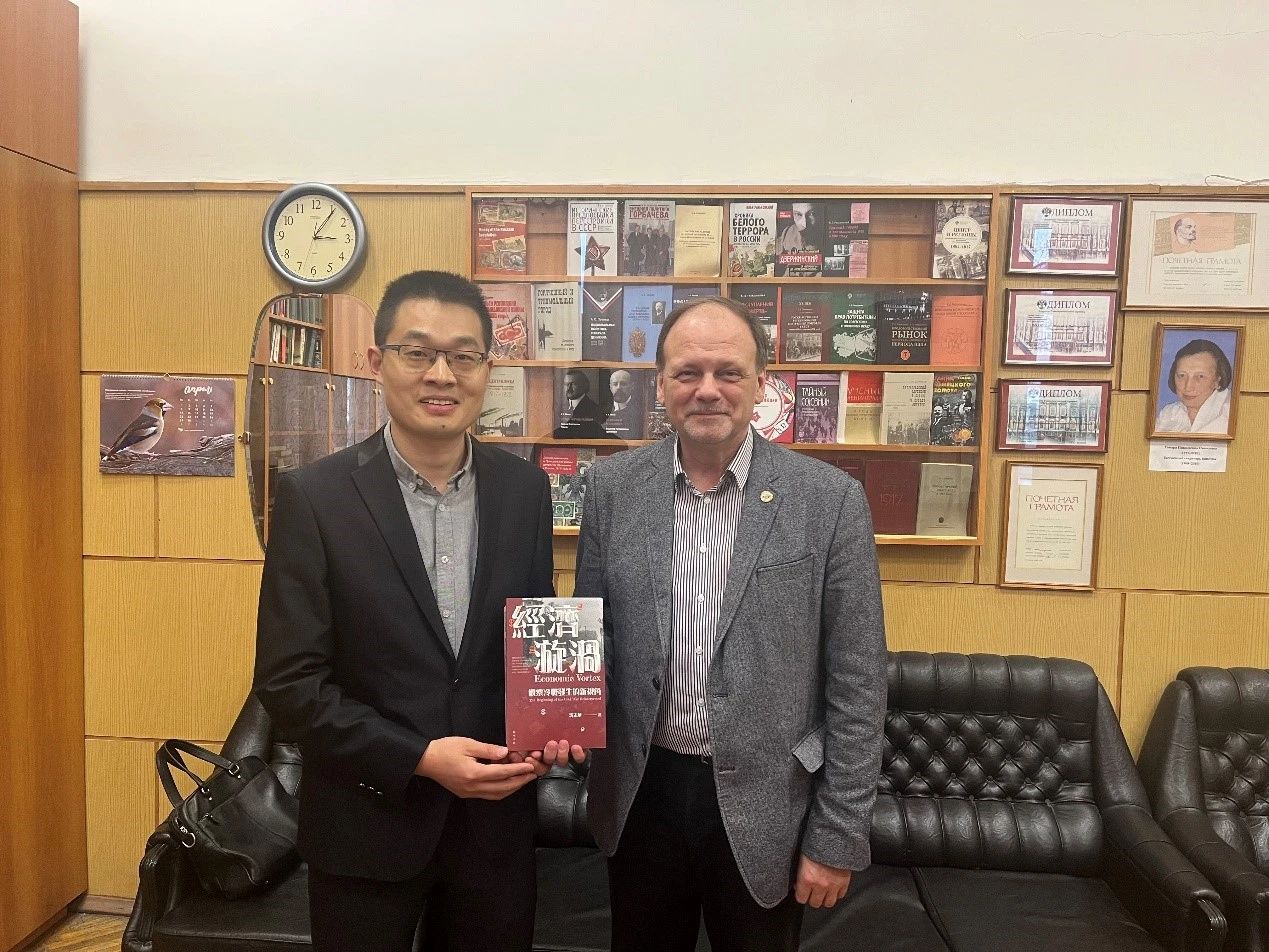 讲座开始前,谷继坤先同禁漫 现代俄国史教研室主任霍佳科夫(М.В. Ходяков)教授进行了简短的学术交流。谷老师首先转达了沈志华教授的问候,并代为送上了沈志华教授签名版新著《经济旋涡—观察冷战发生的新视角》。