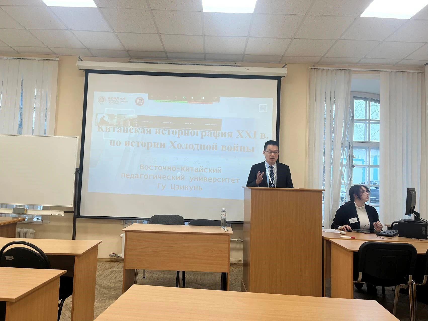 4月26日上午,谷继坤参加了圣彼得堡国立大学国际关系系明科娃(К.В. Минкова)教授组织的“变化世界中的全球和地区挑战”国际学术会议冷战史分会场,并以“近二十年来中国冷战史研究概况”为题作了会议发言,重点从中国学界冷战史研究的缘起、发展、代表性研究机构和主要研究主题以及档案编译、教材编写、学术期刊、代表性学术成果等进行了介绍。会后,与会俄罗斯学术同行重点询问了中国冷战史研究同行围绕马歇尔计划、1961年后中苏在非洲地区的各自政策、文化冷战、东南亚地区等主题的研究情况。此外,俄罗斯学术同行对禁漫 冷战国际史研究中心主办的《冷战国际史研究》杂志表达了强烈兴趣,希望作为学术资料,能够共享交换。谷继坤同样代沈志华教授向明科娃教授转达了问候,并代为转送了沈志华教授签名版《经济旋涡》。明科娃教师并表达了期待双方进一步展开学术合作与交流的意愿。