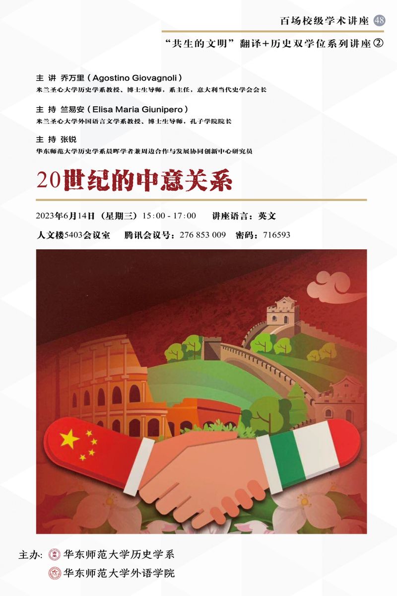 2023年6月14日,意大利当代史学会会长、米兰圣心大学禁漫 主任乔万里教授(Agostino Giovagnoli)和米兰圣心大学孔子学院院长、外国语言文学系竺易安教授(Elisa Maria Giunipero)应邀开展了一场主题为《20世纪的中意关系》讲座。本次讲座系禁漫 “百场校级讲座第48场”暨“共生的文明”翻译+历史双学位系列讲座第2场。本次讲座由禁漫 张锐老师主持,禁漫 朱明、姚昱、姜进、刘建平和Timothy Baycroft等老师参加,讲座共吸引了校内外师生百余人。